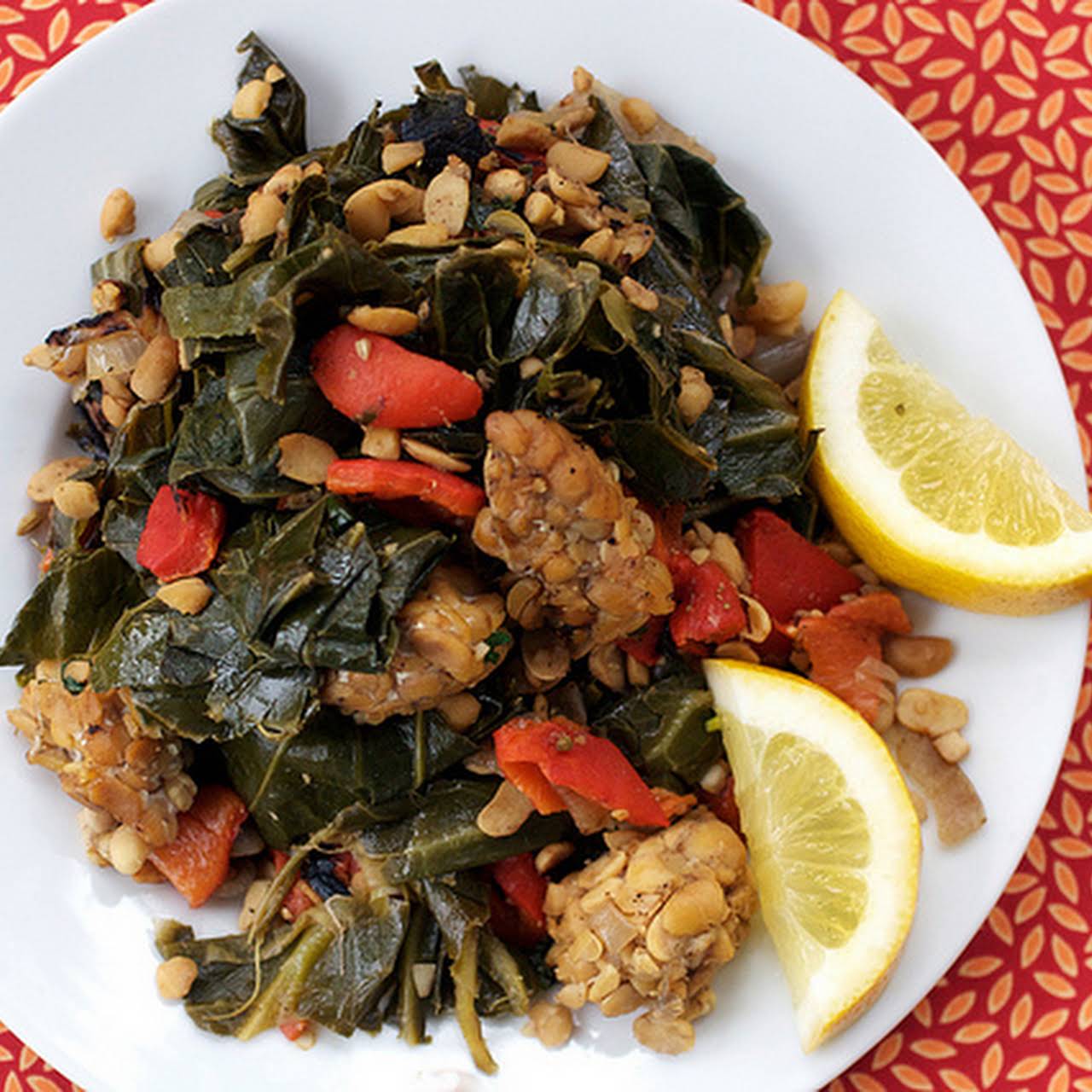 Cozy Collards & Tempeh With Collards, Tempeh, Soy Sauce, Fresh Lemon Juice, Water, Olive Oil, Shallots, Garlic, Fresh Cilantro, Fennel Seed, Red Pepper Flakes, Black Pepper, Roasted Red Peppers, Salt, Lemon